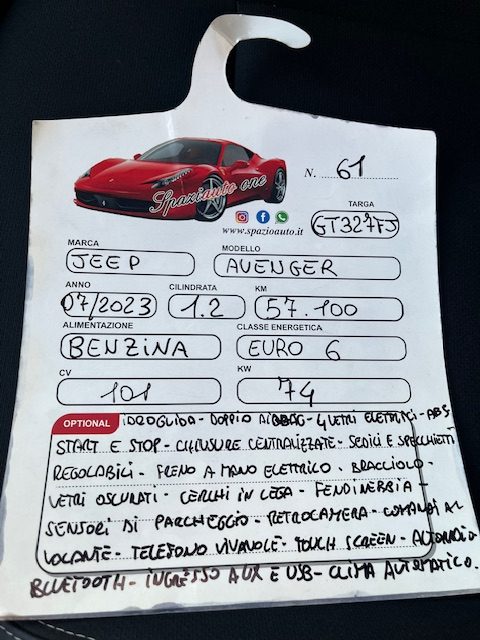 SPAZIAUTO PROPONE IN VENDITA: JEEP AVENGER 1,2 BENZINA ANNO 07/2023 KW 74 CV 100 EURO 6 . KM: 57. 100 POSSIBILITA' DI FINAZIARLA ANCHE SENZA BUSTA PAGA ! PROVENIENZA NORD ITALIA! AUTO IN PERFETTE CONDIZIONI SIA DI MOTORE CHE DI MECCANICA! INCLUSA DI: - 12 MESI DI GARANZIA - 1 TAGLIANDO PRIMA DELLA CONSEGNA. ACCESSORI DI BORDO: , CERCHI IN LEGA,LUCI DIURNE A LED, SENSORI DI PARCHEGGIO, 4 VETRI ELETTRICI , DOPPIO INGRESSO AUX ED USB, COMANDI AL VOLANTE, CRUISE CONTROL ,TELEFONO VIVAVOCE, BLUETOOTH, CLIMATIZZATORE AUTOMATICO, VEGLIA DIGITALE,INTERNI IN PELLE/TESSUTO, BRACCIOLO IN PELLE, FRENO A MANO ELETTRONICO, U- CONNECT, ESP, AUTORADIO, IDROGUIDA, DOPPIO AIRBAG, CHIUSURE CENTRALIZZATE, SEDILI E SPECCHIETTI REGOLABILI. POSIBILITA DI : - PROVA SU STRADA - PERMUTARE IL VOSTRO USATO - FINANZIAMENTI IN SEDE ANCHE SENZA ANTICIPO A TASSI AGEVOLATI! DA NOI TROVERETE UNA VASTA SCELTA DI VEICOLI TUTTI GARANTITI IN GRADO DI SODDISFARE OGNI VOSTRA ESIGENZA!! PER MAGGIORI INFORMAZIONI POTETE CONTATTARCI AI SEGUENTI RECAPITI: TEL: 0813302322 WATS APP : 3917695805 SIAMO A GIUGLIANO (NA)VIA OASI SACRO CUORE 111. .. SIAMO APERTI TUTTI I GIORNI ANCHE LA DOMENICA MATTINA!